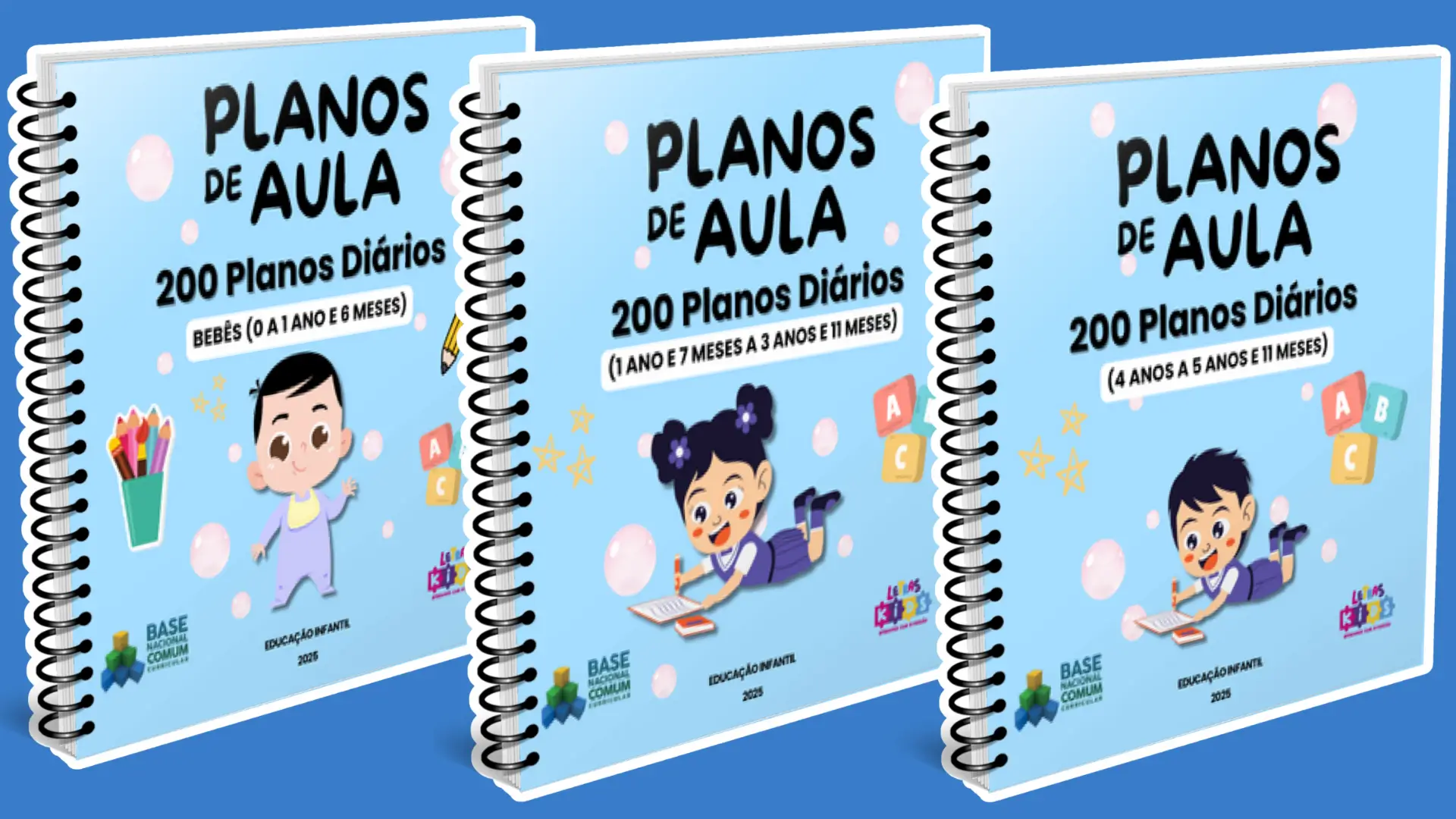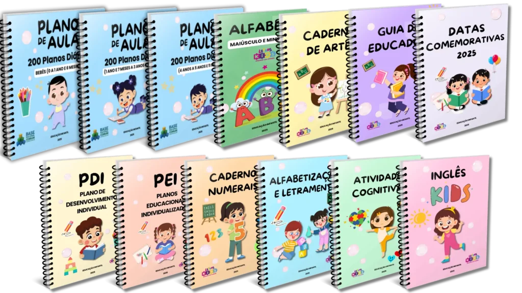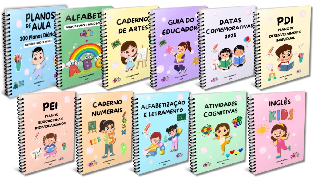 São 200 planos de aula por faixa etária, além do alfabeto, PDI, PEIs, datas comemorativas, guia do educador e caderno de artes.
